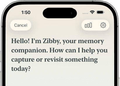 Your voice drives everything. Zibby searches memories, does research, captures photos, saves locations, and connects dots — all from a conversation.